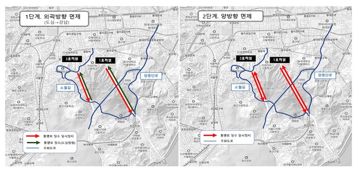 2단계는 4월 17일부터 5월 16일까지 1개월 간 시행되며, 도심과 강남방향 모두 면제된다.