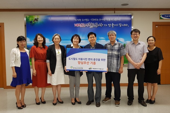 | ▲25일 강난숙 대전·충남소비자연맹 회장(왼쪽 네번째)이 김민기 대전도시철도공사 사장(왼쪽 다섯번째)에게 양심우산 440개를 기증한 뒤 관계자들과 기념촬영하고 있다.<사진제공=대전도시철도공사> |