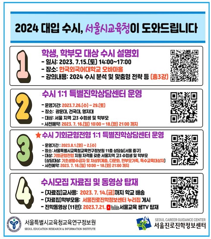 이에 서울특별시교육청 산하 교육연구정보원은 고3 수험생 및 학부모가 2024 대입 수시모집을 효과적으로 대비할 수 있도록 ‘학생・학부모 대상 대입 설명회’ 및 ‘1:1 특별진학상담센터’를 운영한다.