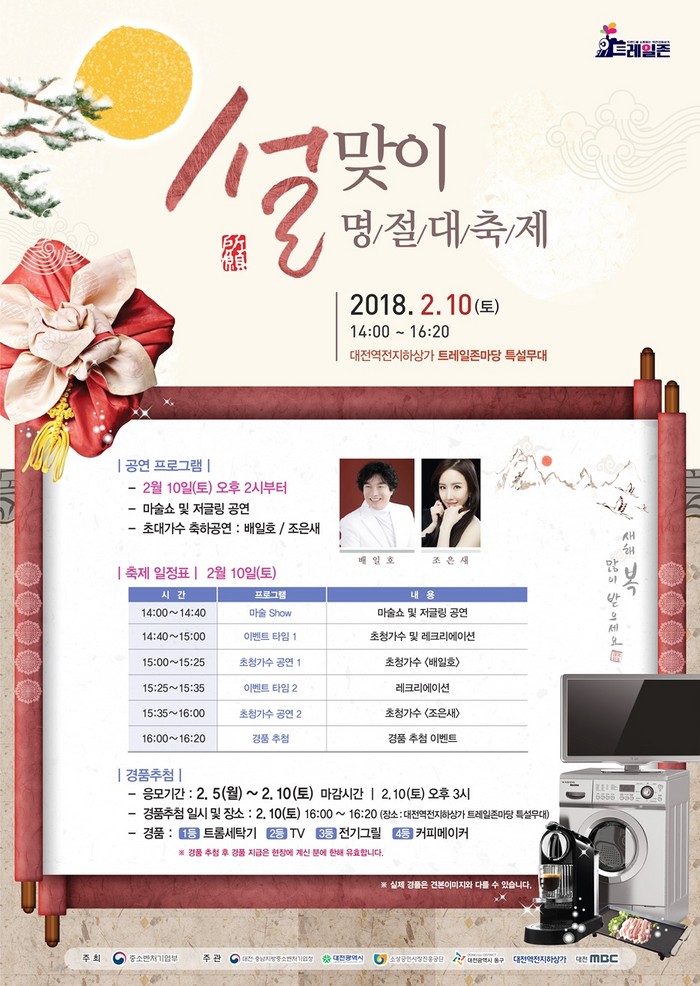 이번 행사는 역전지하상가 상인회 주관으로 민족 대명절인 설날을 맞아 목척교 지하 트레일존마당에서 지역 주민과 상인들이 함께 어우러지는 축제를 통해 역전지하상가를 활성화 시키고자 마련했다.