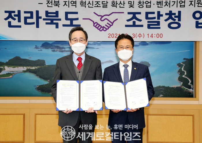 [세계로컬타임즈 조주연 기자] 조달청과 전북도가 3일 전북도청 회의실에서 혁신조달 성과 확산 및 창업·벤처기업 육성을 위한 업무협약을 체결했다.