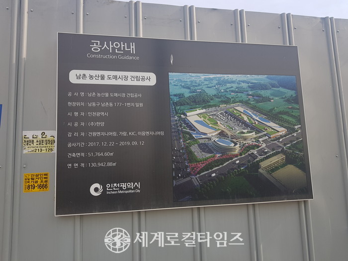 남촌 농산물 도매시장 건립공사 현장은 인천시 시행, 한양 시공이며 감리자는 건원엔지니어링 외 3개업체다. 공사 기간은 2017년 12월 22일~2019년 9월 12일로 돼 있다.