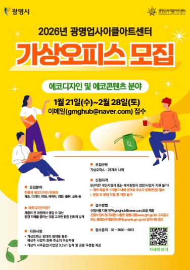 모집 규모는 25개 사 내외이며, 선정 기업은 공유오피스 외에도 회의실, 커뮤니티실 등 부대시설을 광명업사이클아트센터 누리집에서 사전 예약 시 무상으로 이용할 수 있다.