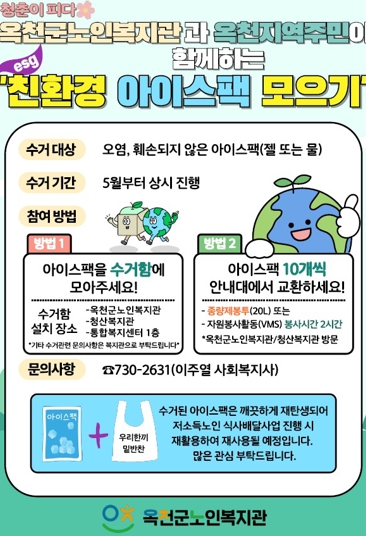 아이스팩은 옥천군노인복지관(본관, 청산분관), 옥천통합복지센터 1층에 설치된 전용 수거함에 직접 배출하거나 10개씩 모아 복지관 안내대에 제출하면 20L 종량제 봉투 또는 자원봉사활동(VMS) 봉사시간으로 교환할 수 있다. 교환을 원하는 경우, 옥천군노인복지관(본관, 청산분관) 안내대를 방문해 신청하면 된다.