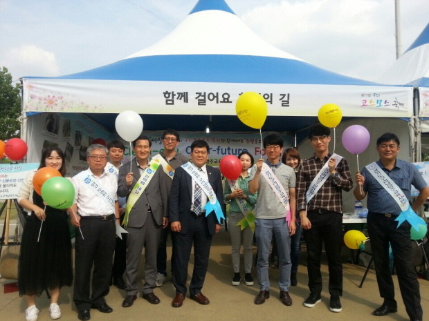 | ▲ 구리남양주교육지원청 직원들이 22일 구리한강시민공원에서 열리는 구리코스모스 축제행사장에서 시민들을 대상으로 청렴캠페인을 전개하며 기념촬영하고 있다.<사진제공=구리남양주교육지원청> |