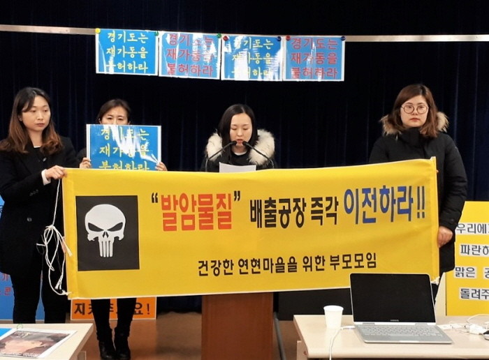| ▲ 지난해 3월 12일 건강한 연현마을을 위한 부모모임 회원들이 경기도의회에서 발암물질 배출로 문제가 된 아스콘 공장 재가동을 반대하는 기자회견을 갖고 있다.(사진=뉴시스) |