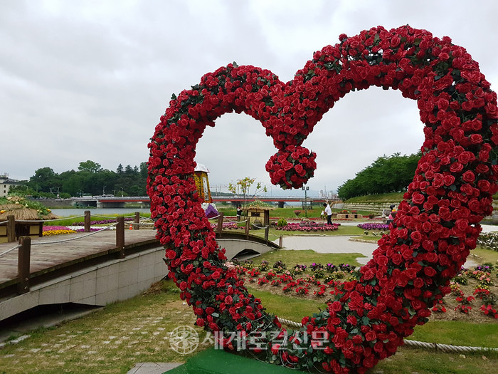 | ▲ 17일 오후 남원 요천변 꽃단지에 장미꽃 모양의 조형물이 세워져 있다. |