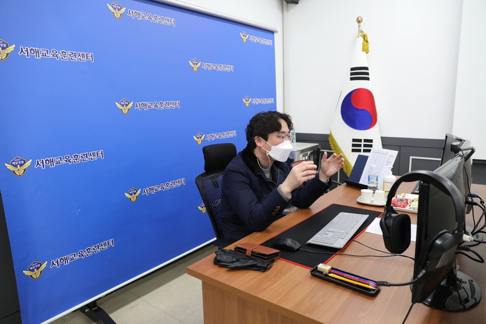 | ▲서해교육훈련센터에서 이효철 호남대학교 응급구조학과 교수가 비대면으로 현장부서 직원 대상 응급처치 역량 강화 교육을 하고 있다.(사진=서해지방해양경찰청 ) |