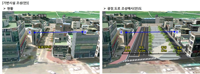 시는 총 사업비 345억원을 들여 기존에 2차로였던 병점역 진입로를 4차로로 확대하고 폭 17m 규모의 중앙광장을 2019년 말까지 건설할 계획이다.