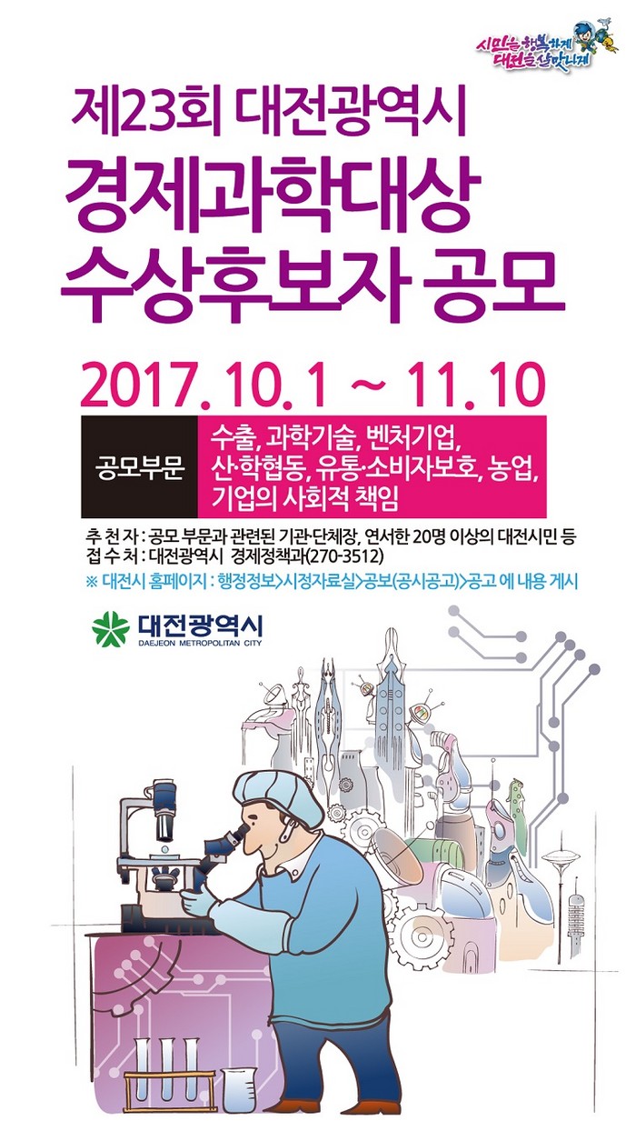 [세계로컬신문 오영균 기자] 대전시가 제23회 대전경제과학대상 수상 후보자를 공모한다.