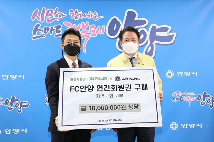 [세계로컬타임즈 장관섭 기자] FC안양 최대호 구단주는 환경시설관리(주) 컨소시엄과 지난 8일 2021 FC안양 연간회원권 1000만원 상당을 지역사회를 위해 기부했다고 9일 밝혔다.