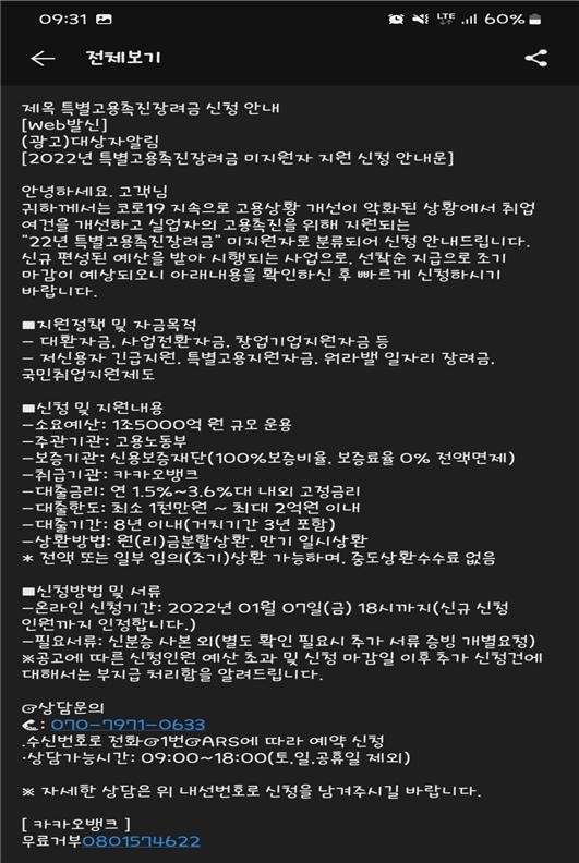 “귀하께서는 코로나19 피해 소상공인 정책자금 특별융자 신청대상이나 현재까지 신청하지 않은 것으로 확인되어 재안내 드립니다… 신청방법은 http://##.### 또는 상담전화 02-△△△△-△△△△입니다.” |