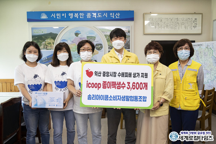 [세계로컬타임즈 조주연 기자] 솜리아이쿱소비자생활협동조합(이하 조합)이 전북 익산 중앙동의 수해 상가를 위해 종이팩 생수를 기탁했다.