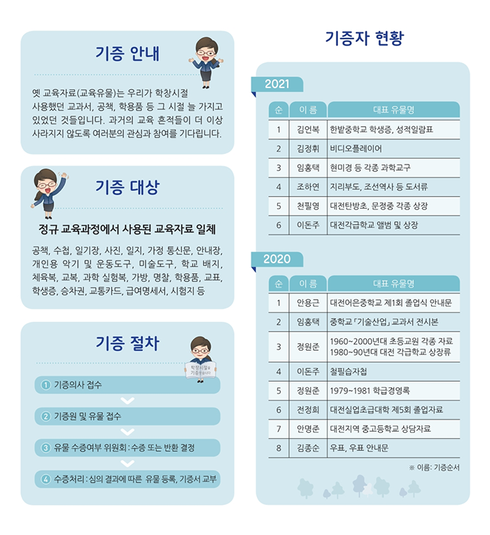 기증대상은 정규 교육과정에서 사용된 각종 교육 자료들로 △학교 수업시간에 사용한 각종 교구, △학생 및 교원이 기록한 공책, 일기장, 경영록, 안내문, △교복, 체육복, 교모 등 학교생활 중 착용한 복식자료, △각종 학용품 및 학습 준비물, 명찰, 학생증, 책가방 등으로 다양하다.
