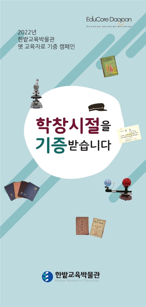 [세계로컬타임즈 민순혜 기자] 한밭교육박물관(관장 김종무)은 개인 및 학교, 기관이 소장하고 있는 옛 교육자료를 발굴, 수집하고자 2022년도 옛 교육자료 기증 캠페인 ‘학창시절을 기증받습니다’을 실시한다고 밝혔다.
