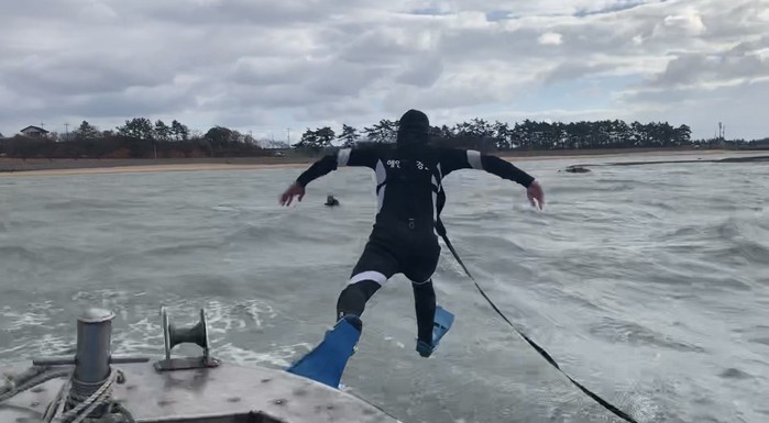 | ▲ 익수자를 발견한 해양경찰관이 구조를 위해 바다에 직접 입수하고 있다.(사진=목포해경) |