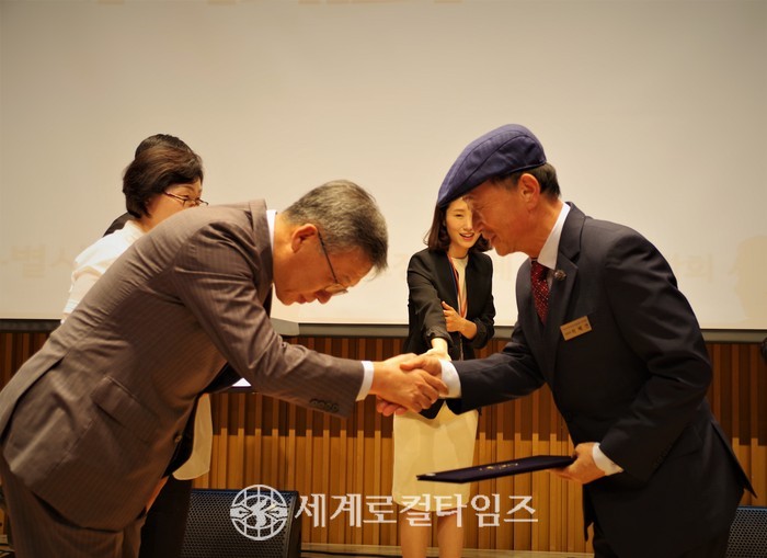 | ▲ 박원순 서울시장을 대신한 강태웅(왼쪽) 서울시 행정1부시장이 이배연 세계일보 조사위원회 중앙위원에게 표창장을 수여하고 인사하고 있다. |