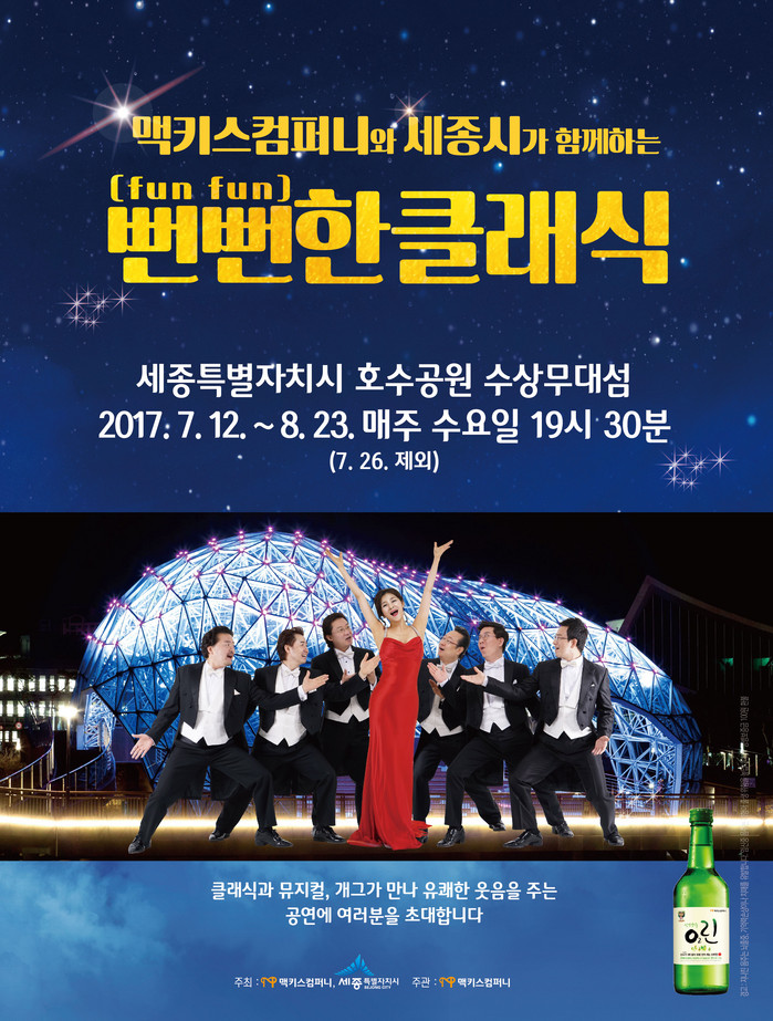 맥키스 컴퍼니는 오는 12일부터 8월 23일까지(7월 26일 제외) 매주 수요일 오후 7시 30분부터 세종시 호수공원 수상무대섬에서 맥키스오페라 ‘뻔뻔(fun fun)한 클래식’ 무료 정기 공연을 개최한다고 10일 밝혔다.