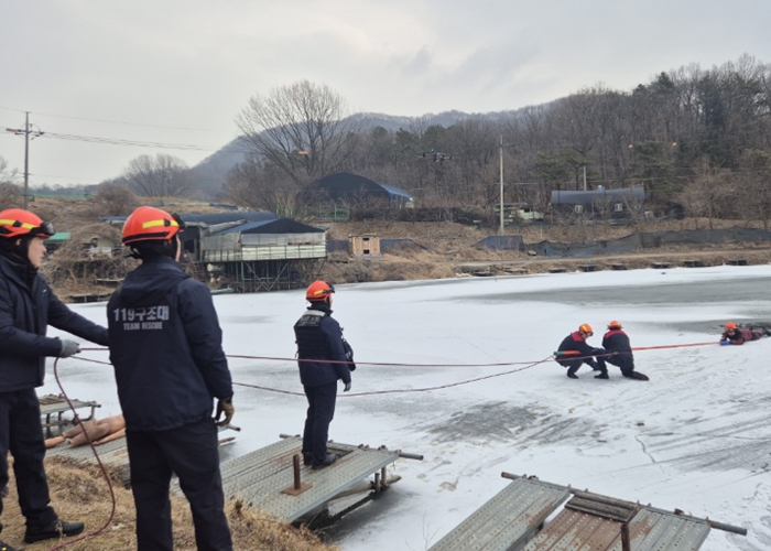 주요 훈련 내용은 ▲동계 수난구조장비 점검 및 관리 방법 ▲수상·수중 구조기법 팀 단위 훈련 ▲비상상황 발생 시 대응요령 ▲소방드론을 활용한 구조대상자 위치 파악 등 실전 중심 프로그램으로 구성됐다.