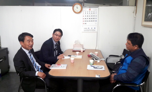 | ▲ 27일 김창희 시장 예비후보(왼쪽)가 원진산업재해자협회 관계자들과 만나 간담회를 하고있다. <사진제공=김창희 선거 사무실> |