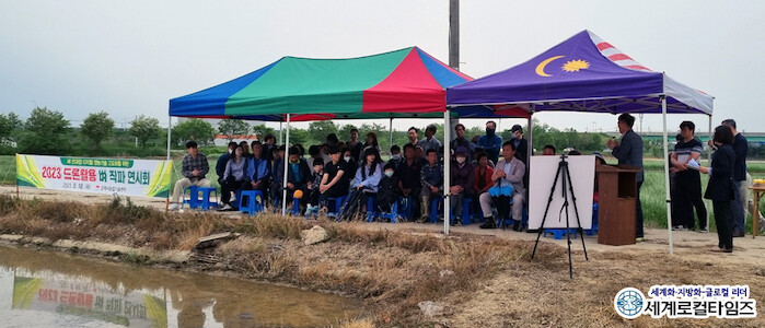 [세계로컬타임즈 조주연 기자] 전북 김제에서 18일, 벼농사 이앙 전 육묘 단계의 농작업 노동력을 줄여 줄 드론직파 연시회가 열렸다.