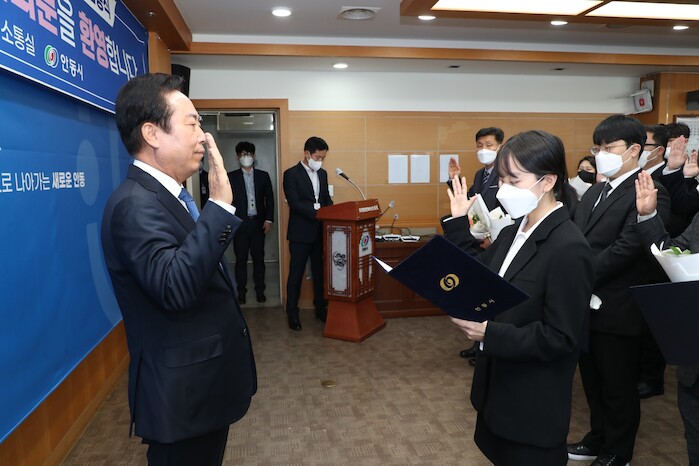 이날 시청 웅부관 소통실에서 민선 8기 출범 후 처음으로 열린 신규 공무원 임용식은 권기창 시장과 이상학 부시장 및 국장 등 간부 공무원들이 참석해 새내기 공무원들의 공직 임용을 축하하고 격려했다.