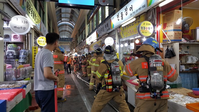 이번 훈련은 시장 한가운데 입점한 점포에 원인모를 화재가 발생한 것을 가정해 시장자율소방대에 의한 초기 소화활동을 시작으로 소방차 통행로 확보 및 화재지점까지 신속한 소방호스 전개, 시장 내 설치된 소방시설 활용 화재진압훈련 등으로 이뤄졌다.