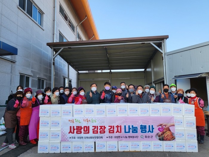 화순군은 지난 6일부터 8일까지 3일간 이양면 복지회관에서 유명기 이양면장을 비롯한 면 직원, 이양면 지역사회보장협의체, 이양면 e-나눔 행복봉사단, 이양청풍농협 직원 등 40여 명이 참여한 김장김치 나눔 행사가 있었다고 밝혔다.
