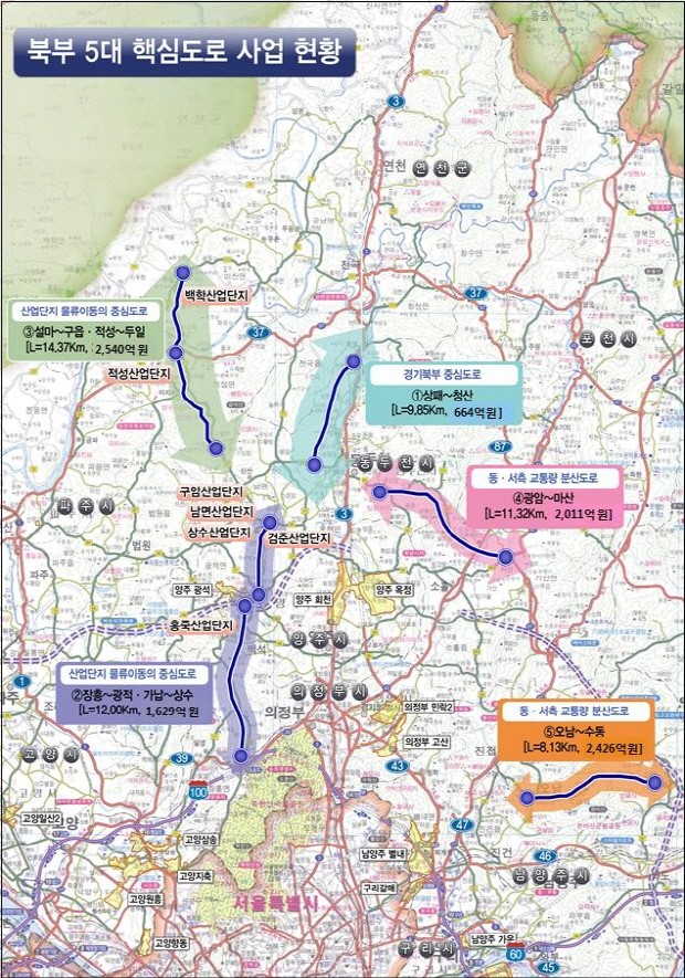 경기도는 지난 2014년 경기북부 지역 발전을 위해 ▲국대도 3호선 상패~청산 ▲국지도 39호선 장흥~광적·가납~상수 ▲국지도 98호선 오남~수동 ▲지방도 371호선 적성~두일·설마~구읍 ▲지방도 364호선 광암~마산 등에 매년 800억 원 이상을 투자해 왔다.