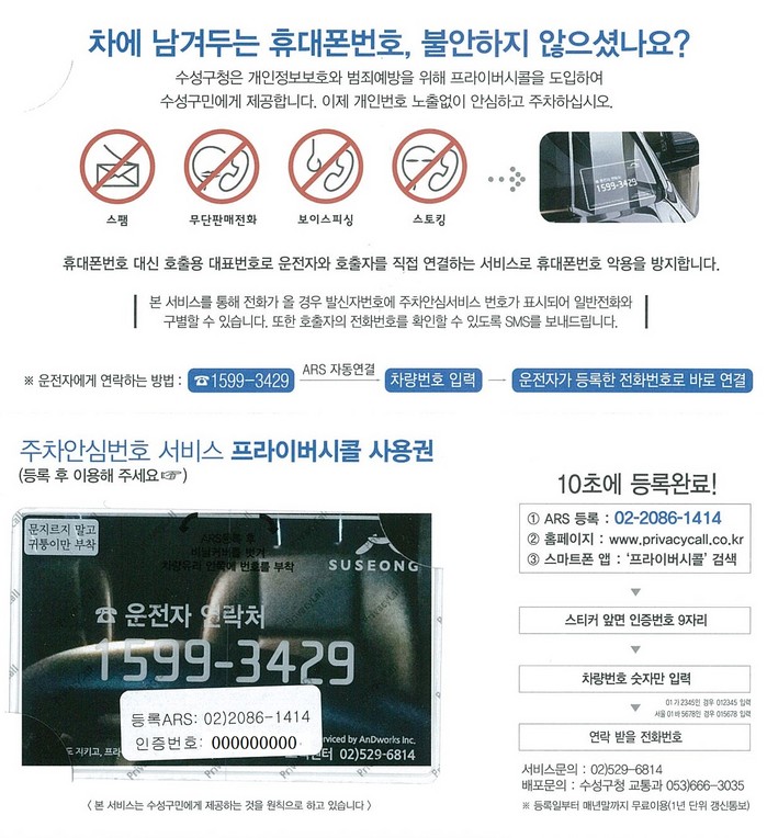 | ▲ 주차안심번호 서비스 안내 이용권.(사진=수성구 제공) |
