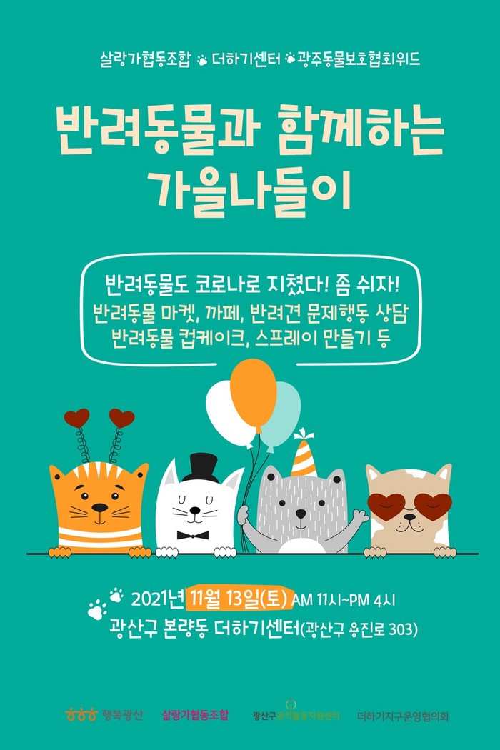 살랑가협동조합과 함께 진행하는 이번 행사에서는 수공예로 만든 반려동물 용품 마켓과 반려동물 컵케이크, 스프레이 만들기, 반려동물과 함께하는 동화구연, ‘간신 두 손 가득’ 등 이벤트, 반려동물 야외카페, 일러스트 전시회 등이 열린다.