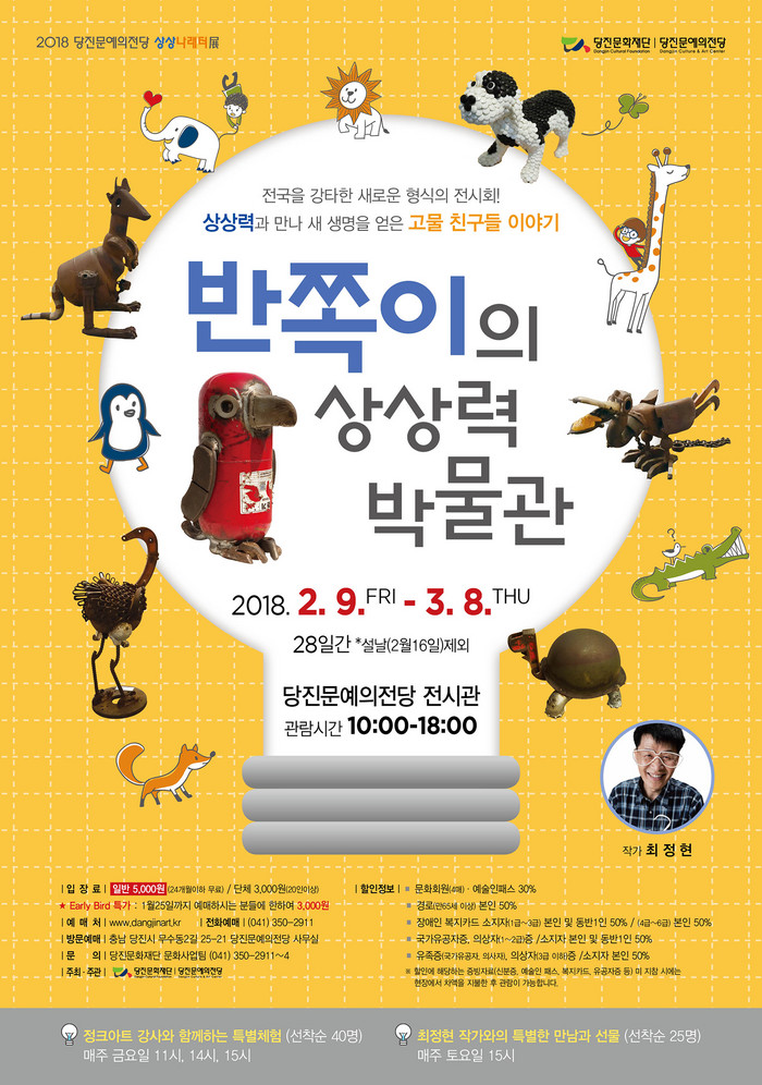 [세계로컬신문 홍윤표 조사위원] 재단법인 당진문화재단이 겨울방학과 신학기 시즌을 맞이해 온 가족이 함께 즐길 수 있는 ‘2018 당진문화재단 상상나래展 반쪽이의 상상력 박물관’을 다음달 9일부터 3월 8일까지 개최한다.