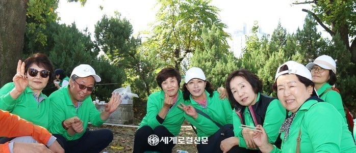 | ▲동구 효동 통장협의회 각 통장들이 손으로 브이를 만들어 보이며 승리를 확신했다.<사진=오영균 기자> |
