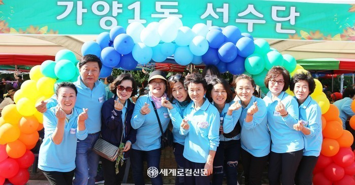 | ▲ 동구 가양1동 선수단이 손가락 하트모양을 하며 파이팅 외치고 있디. <사진= 오영균 기자> |