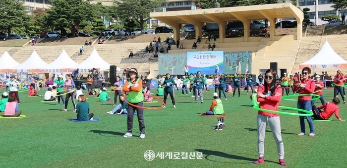 | ▲동구 동아마이스터고 운동장에서 열린 구민화합 한마당 행사는 각 동 대표로 출정한 훌라후프 선수들이 열띤 경기를 펼치고 있다.<사진= 오영균 기자> |