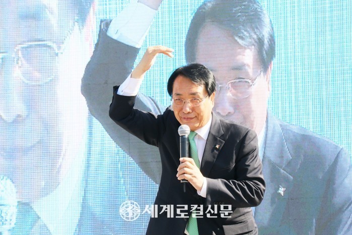 | ▲ 한현택 동구청장이 기념사에서 손으로 하트모양을 만들어 구민들께'사랑합니다' 인사하고 있다.<사진= 오영균 기자> |