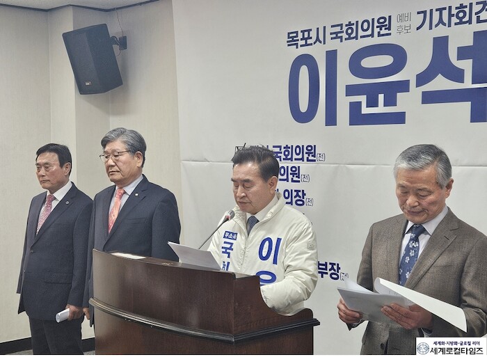 [세계로컬타임즈 김명진 기자] 목포시 국회의원 선거에 나서는 이윤석 예비후보는 더불어민주당 경선에서 고배를 마신 배종호 예비후보 선대본부장단과 함께 목포시의회 시민의방에서 기자회견을 갖고 오는 총선에서 무능한 현역의원을 심판할 것이라고 선언했다.
