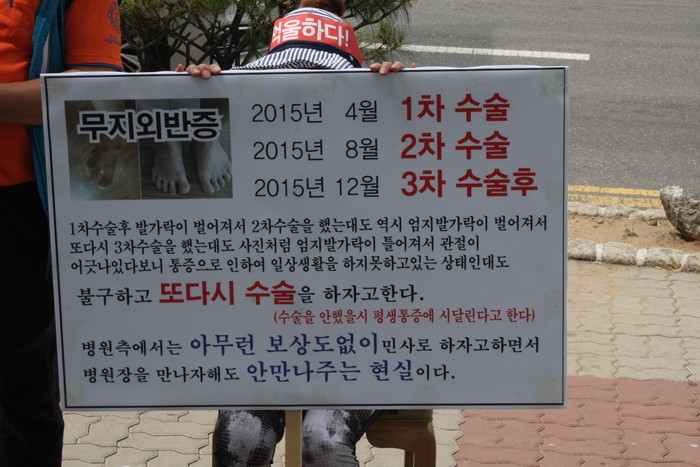 | ▲ 3번의 '무지외반증' 수술 후 후유증에 시달린다며 보상을 요구하며 유모씨가 병원 앞에서 시위를 하고 있다. |