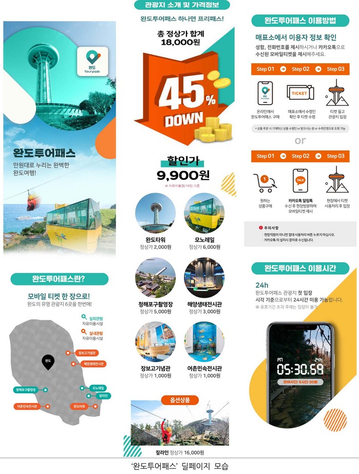 완도타워, 청해포구 촬영장, 모노레일, 장보고기념관, 해양생태전시관, 어촌민속전시관 등 6곳을 둘러 볼 수 있는 ‘완도 투어패스’는 최초 사용시각 부터 24시간 동안 사용이 가능하다.