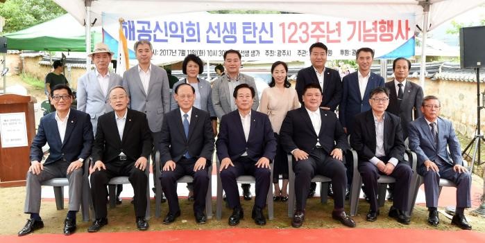 | ▲ 11일 광주시 초월읍 서하리 신익희 선생 생가에서 해공 신익희 선생 탄신 123주년 기념행사를 연 후 참석자들이 기념촬영하고 있다.<사진제공=광주시청> |