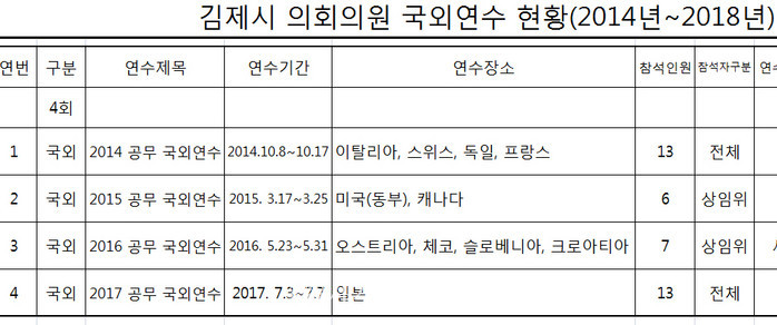 | ▲ 김제시가 정보공개한 시의원 해외연수 일정. |