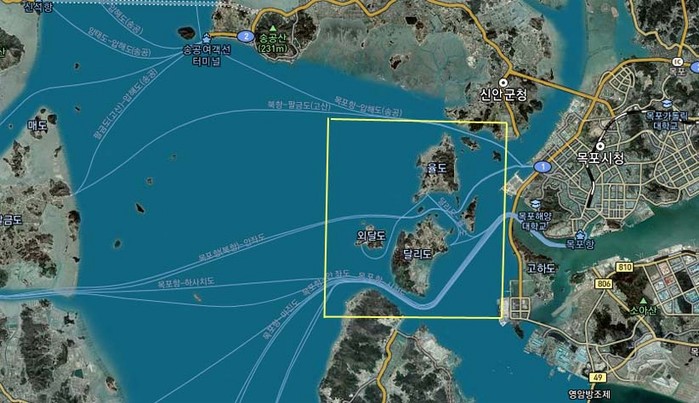 ▲ 전남 해남군이 국도 77호선의 마지막 미완구간인 해남 화원-달리도-율도-신안압해를 연결짓는 연도교의 조속한 개설을 건의하고 나섰다. 사진 박스 윗부분이 신안 압해도,아랫부분이 해남군 화원면. |
