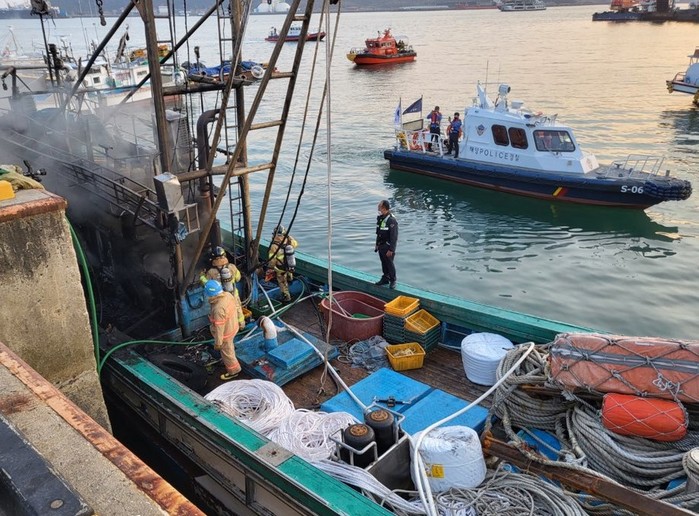 | ▲남항 인근에 계류 중이던 선박에서 화재가 발생해 목포해경과 목포소방 관계자들이 진화 작업에 나서고 있다.(사진=목포해경) |