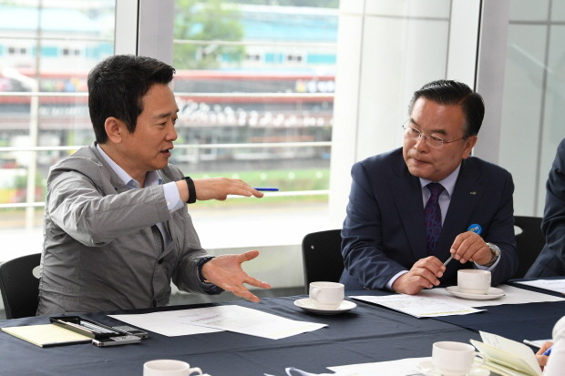 | ▲ 이성호 양주시장(오른쪽)이 7일 양주시를 방문한 남경필 경기도지사와 간담회를 열고 지역 현안사업을 건의하고 있다.<사진제공=양주시청> |