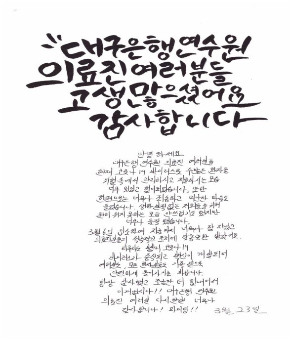 완치 판정을 받고 퇴소 하면서 “대구은행연수원 의료진 여러분들 현재 코로나19 바이러스로 수많은 환자들 위험 속에서 관리하고 치료하시는 모습 너무 멋있고 힘이 되었습니다. 한편으로는 너무나 죄송하고 미안한 마음도 들었습니다. 생판 본적 없는 저희들을 위해 편히 쉬지 못하는 모습 안쓰럽기도 했지만 너무나 듬직했습니다. 3월 6일 입소하여 지금까지 너무나 잘 지냈고 의료진분들의 적극적인 조치에 감동 받았어요. 하루라도 빨리 코로나19 바이러스가 종식되고 백신이 개발되어 여러분도, 모든 환자분들도 가족 곁으로 안전하게 돌아가기를 바랍니다. 항상 감사했고 조금만 더 힘내어서 이겨냅시다! 대구은행연수원 의료진 여러분 다시 한 번 너무나 감사합니다! 파이팅!”이라며 감사의 뜻을 전했다.