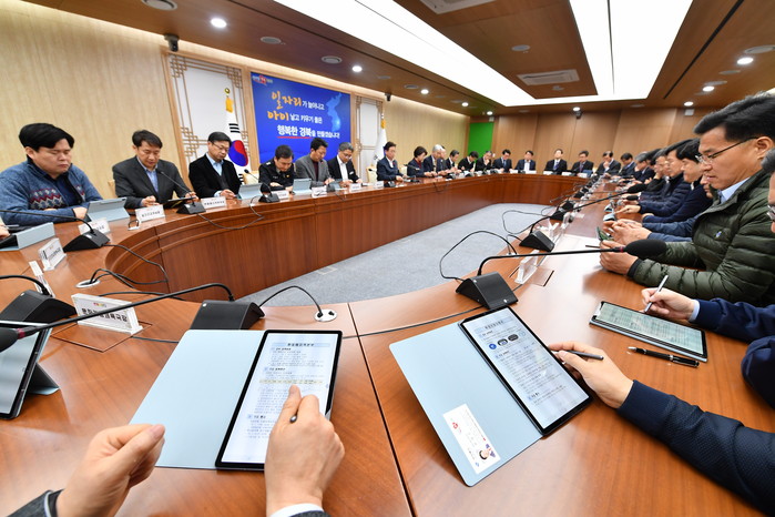 세계로컬타임즈 최영주 기자] 경상북도는 첫 확대간부회의에서 종이보고서 대신 테블릿 PC를 이용한 디지털 회의를 진행했다.