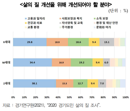 경기연구원은 지난해 9월부터 11월까지 경기도 1만 6,000여 가구를 대상으로 실시한 ‘2020 경기도민 삶의 질 조사’를 활용한 ‘MZ세대를 들여다보다’ 보고서를 발간했다고 28일 밝혔다.