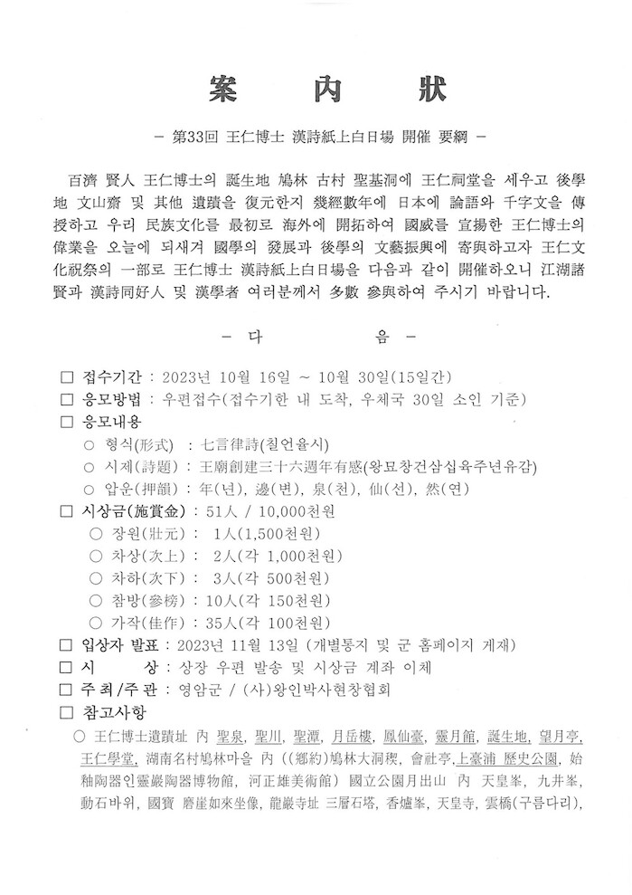 [세계로컬타임즈 최진기 기자] 영암군이 이달 16~30일 ‘제33회 왕인박사 추모 한시 백일장대회’ 작품을 모집한다.