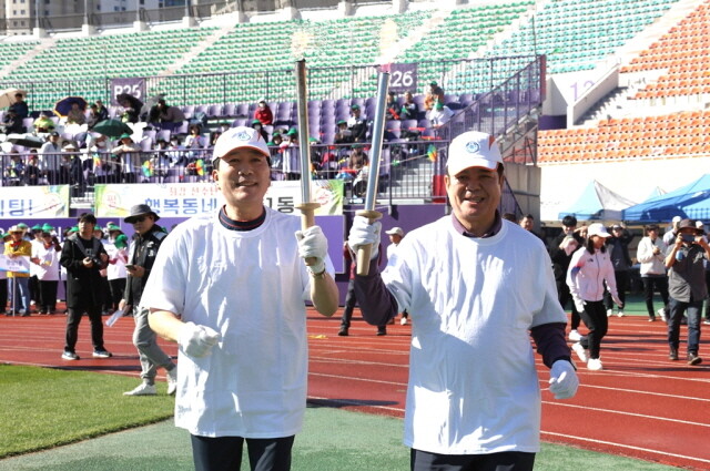 ▲ 2023 시민 한마음 체육대회에서 최대호(사진 오른쪽) 안양시장과 박귀종 안양시 체육회장이 성화봉송을 하고 있다. (사진=안양시) |