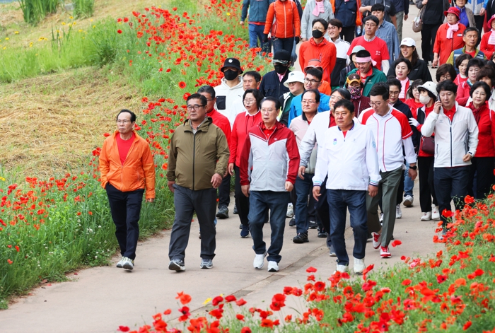 양귀비가 만개한 산책로를 따라 가족, 친구, 동호회 단체 등 다양한 연령층의 참가자들이 행렬을 이뤘다.